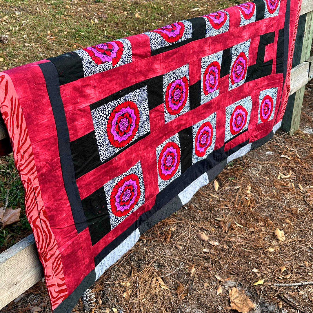 This handmade quilt by Lillie, titled "Pink Carnation Flora Squares," is a striking and elegant piece that showcases a blend of floral beauty and modern geometric design. It’s laid over a weathered wooden fence, its colors contrasting beautifully with the natural, rustic background.The quilt's design is built around a series of repeating square blocks. The central feature of each square is a bold, stylized pink carnation with a vibrant red center, set against a background of black and white dots. The flower's petals are rendered in layers of pink, from deep magenta to a bright fuchsia, giving them a three-dimensional appearance.These central floral squares are framed by a grid of solid and patterned fabrics. The primary color is a deep, rich red, used in wide horizontal and vertical strips that create a lattice pattern across the quilt. Intersecting these red strips are narrow black sashing pieces that provide a strong, clean outline for the squares, making the floral blocks stand out even more.The border of the quilt is particularly eye-catching. On the left side, a broad vertical strip features a subtle, tone-on-tone pattern that appears to be an animal print—possibly a zebra or tiger—in a matching shade of deep red. This unexpected detail adds an element of wildness and texture, tying the entire design together.The overall impression is one of sophisticated balance. The bold floral motifs are contained and organized by the strong geometric lines of the quilt's construction. The combination of black, white, red, and pink creates a classic yet contemporary feel. This quilt is a wonderful example of how traditional quilting can be fused with modern aesthetics to create a unique and beautiful work of art.